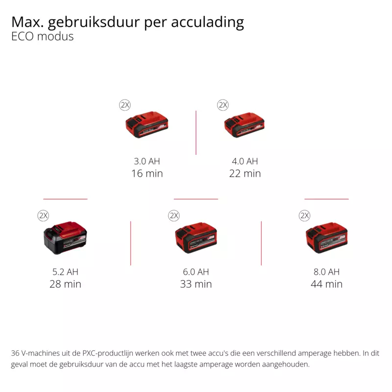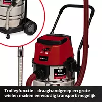 De Einhell accu Nat-/Droogzuiger genereert een maximaal zuigvermogen van 150 mbar bij het mondstuk, met puur, flexibel accuvermogen. Als onderdeel van de Power X-Change productlijn wordt de Nat-/Droogzuiger gevoed door 2x 18 volt PXC-accu's: Dit zorgt tegelijkertijd voor een hoge zuigkracht en draadloze vrijheid. Twee snelheden halen het maximale uit de accu’s. Het stevige, RVS-reservoir heeft een inhoud van 30 liter. Vuil water kan via de handige waterafvoerschroef worden afgevoerd. De blaasaansluiting is geschikt voor het uitblazen van moeilijk toegankelijke plaatsen, bijvoorbeeld hoeken of achter radiatoren. De grote wielen en de zwenkwielen zorgen voor mobiliteit en een eenvoudig transport. De nat-/droogzuiger kan in de werkplaats of de garage met verschillende Einhell-machines worden verbonden. Dankzij de connectiviteitsfunctie gebeurt de stofafzuiging zonder kabelverbinding, de stofzuiger start automatisch bij het starten van het accu gereedschap. Een praktische accessoirehouder houdt accessoires opgeruimd en mondstukken binnen handbereik. Inbegrepen bij levering zijn een telescopische zuigbuis van roestvrij staal (Ø36 mm) met luchtregelaar en een 2,5 meter lange, zwaar belastbare kunststof slang (Ø36 mm). Daarnaast zijn bij levering inbegrepen een groot combimondstuk, een spleetmondstuk, een bekledingsmondstuk, een schuimstoffilter, een plooifilter, een stofzuigerzak, de zendunit voor de connectiviteit, een bevestigingsband en een USB-oplaadkabel. Geleverd zonder accu en lader. Deze zijn apart verkrijgbaar, bijvoorbeeld als handige Power X-Change starterset. Voor optimale resultaten wordt een accu van 3.0Ah of hoger aanbevolen.