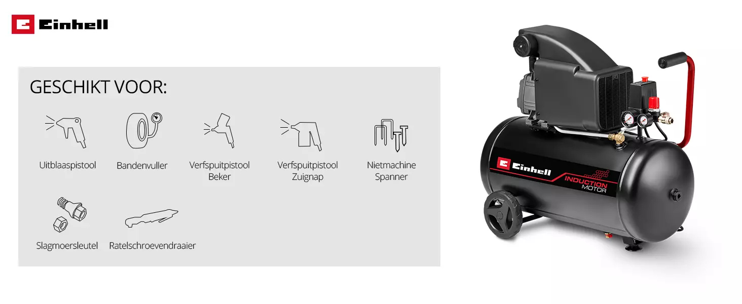 De Einhell Compressor TC-AC 270/50/10 is een handige hulp in werkplaats en garage. Of het nu gaat om het aanbrengen van verf en lak, het bedienen van gereedschap of gewoon het oppompen van banden: dankzij de krachtige inductiemotor met een vermogen van 1.800 watt en een aanzuigcapaciteit van 270 l/min is de compressor geschikt voor alle werkzaamheden. De maximale werkdruk van 10 bar kan handmatig worden ingesteld met behulp van de drukregelaar. Er is een manometer voor de ongeregelde keteldruk en één voor de geregelde werkdruk aanwezig. De grote tank met een inhoud van 50 liter biedt voldoende persluchtreserves voor veel persluchtwerkzaamheden. Dankzij een draaghandgreep en twee stabiele wielen kan de oliegesmeerde compressor snel en eenvoudig naar de gewenste werkplek worden vervoerd. Het gecondenseerde water kan eenvoudig worden afgevoerd via een afvoerschroef.