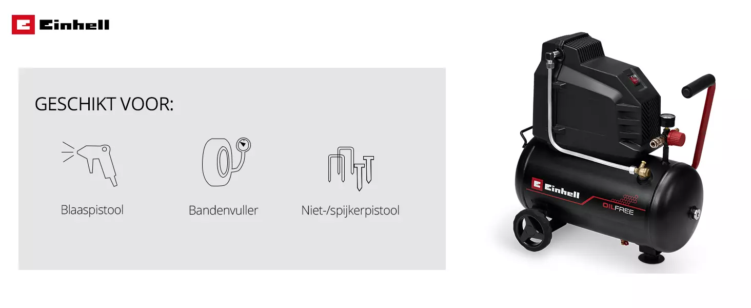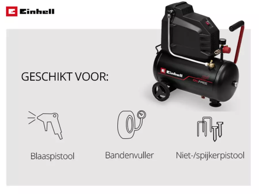 De Einhell Compressor TC-AC 190/24/8 I OF is een krachtige en veelzijdig inzetbare compressor die ideaal is voor DIY-liefhebbers. Dankzij de robuuste inductiemotor met een vermogen van 1.100 watt levert de compressor constante prestaties, zelfs bij intensieve toepassingen. De olievrij pomp garandeert minimaal onderhoud en heeft een aanzuigcapaciteit van 190 l/min. De luchtopbrengst bij 4 bar is 75 l/min. Dit maakt de Compressor bijzonder aantrekkelijk voor gebruik in werkplaatsen of garages. Met de geïntegreerde drukregelaar kan de werkdruk nauwkeurig worden afgesteld tot een maximumwaarde van 8 bar. Voor het controleren van de werkdruk is een eenvoudig afleesbare manometer geïntegreerd, die nauwkeurige controle en afstelling mogelijk maakt voor het bereiken van optimale werkresultaten. Bovendien zorgt de trillingsgedempte standvoet voor een veilige en stabiele stand tijdens het gebruik, zelfs tijdens langere gebruiksperioden. Bovendien maken de praktische draaghandgreep en de stabiele wielen het transport van de compressor eenvoudig, zodat deze flexibel op verschillende locaties kan worden gebruikt. Met een garantieperiode van 10-jaar tegen het doorroesten van de tank, biedt de Einhell Compressor TC-AC 190/24/8 I OF een bijzonder hoge levensduur en is daarom een betrouwbare keuze voor vele projecten.