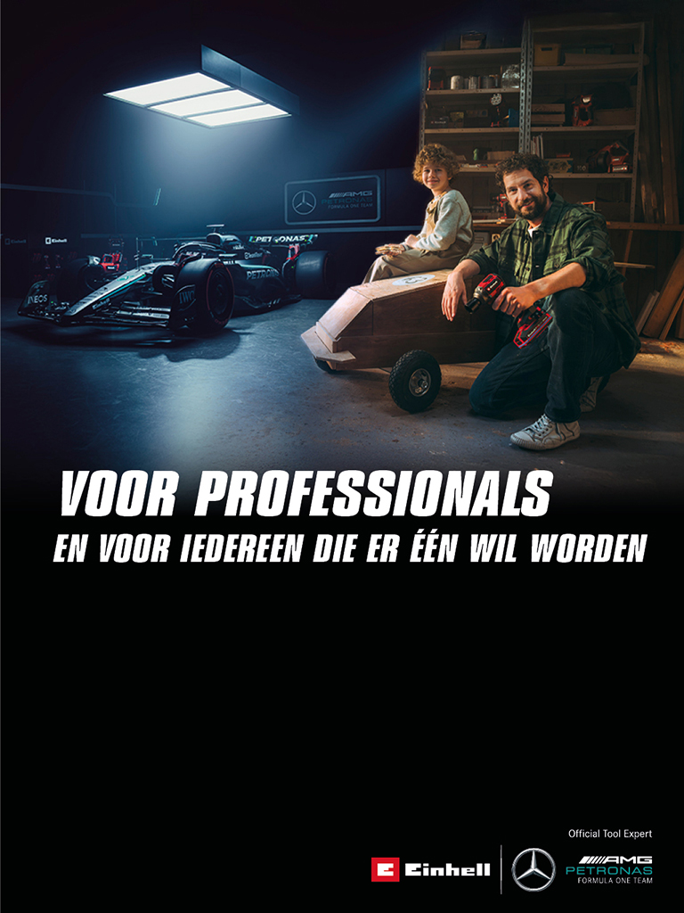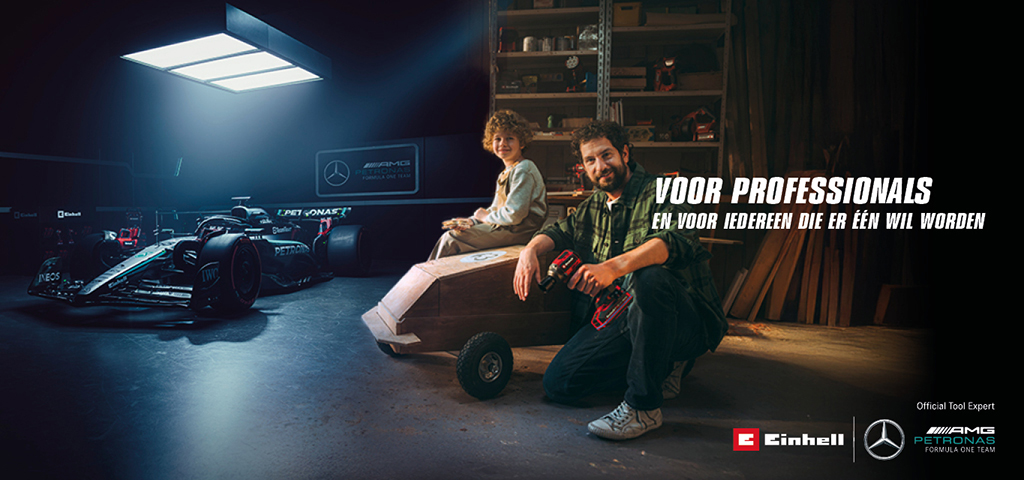 Onze campagne laat op speelse wijze de verbinding zien tussen twee werelden die wij bij Einhell elke dag opnieuw creëren: de prestatiegerichte wereld van professionals in de garage van het Mercedes-AMG PETRONAS Formule 1 Team en de creatieve doe-het-zelf wereld, waar vader en zoon plotseling veranderen in professionele automonteurs.